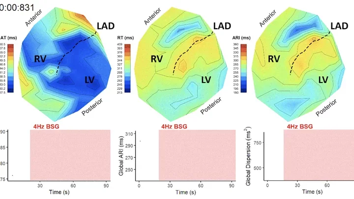 Pictured: Polar maps are spatial depictions of the duration of cardiac action potentials across both ventricles of the heart. In response to pathological changes caused by cardiovascular disease, as well as various interventions including drug administration and nerve stimulation, differences in action potential duration across the heart can be observed.